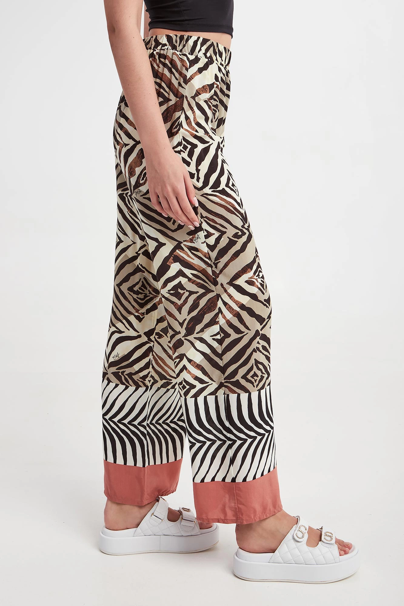 - Nogawki wykończone koralową lamówką.