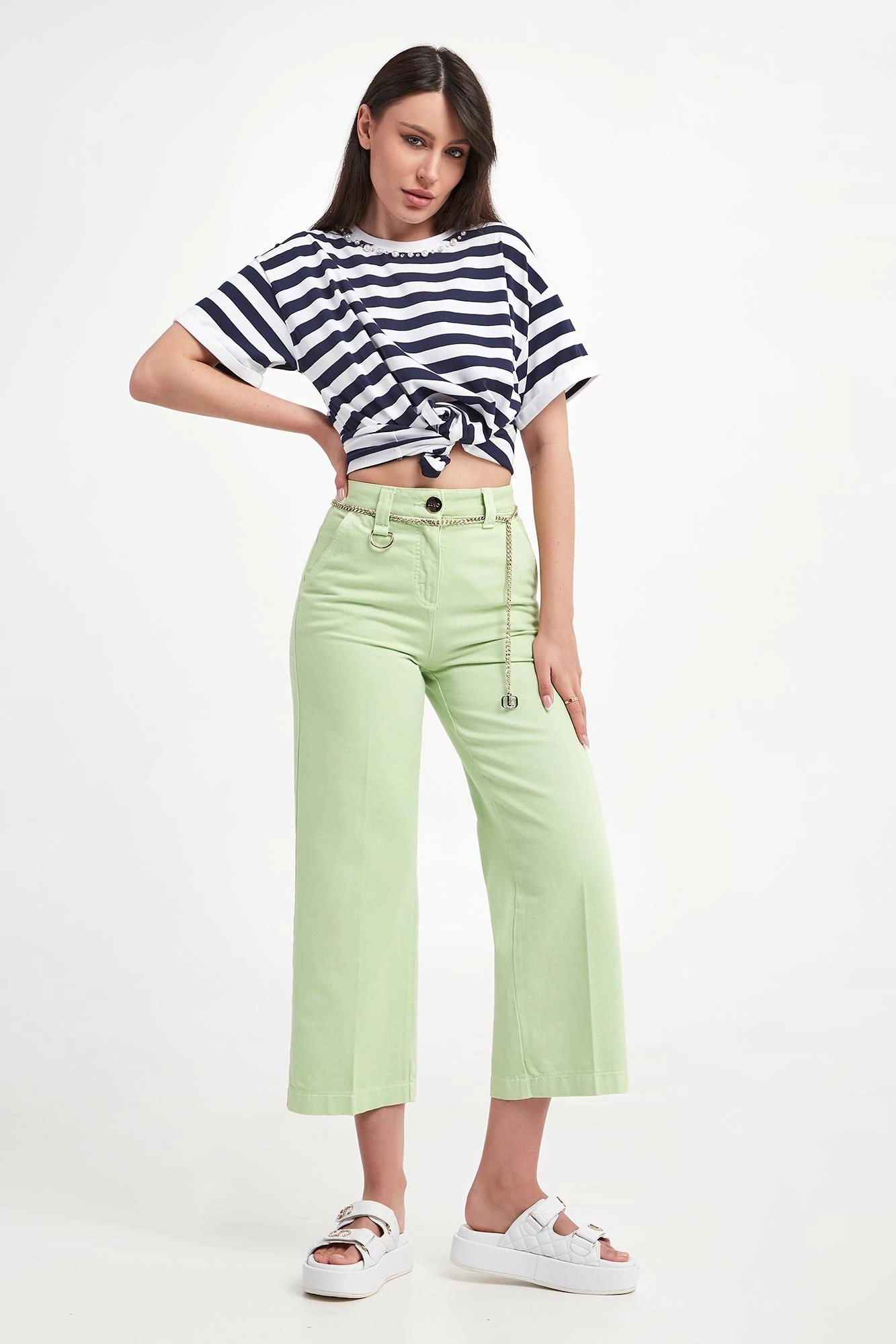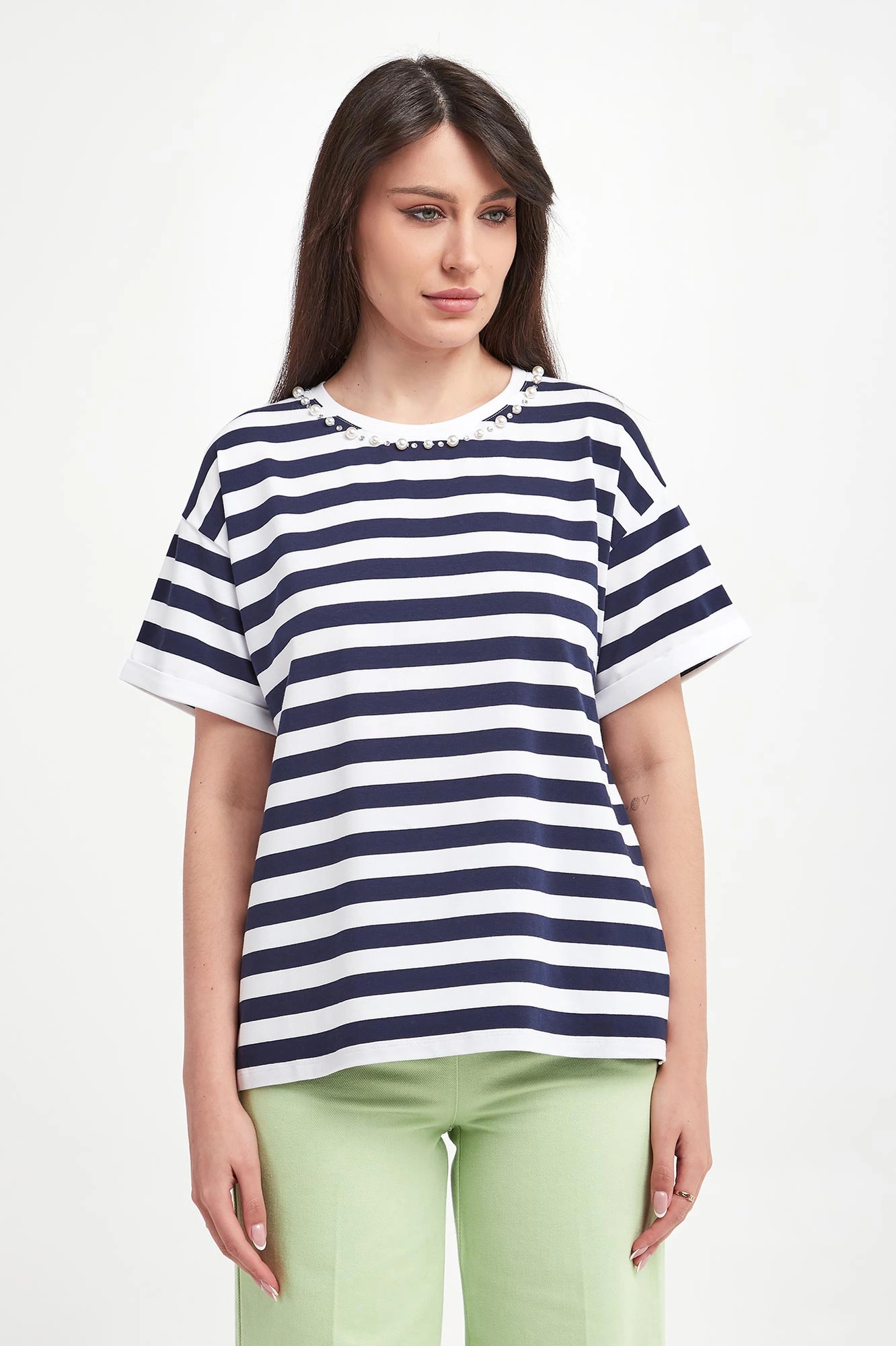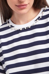 - Dekolt o-neck ozdobiony perłami i kryształkami.