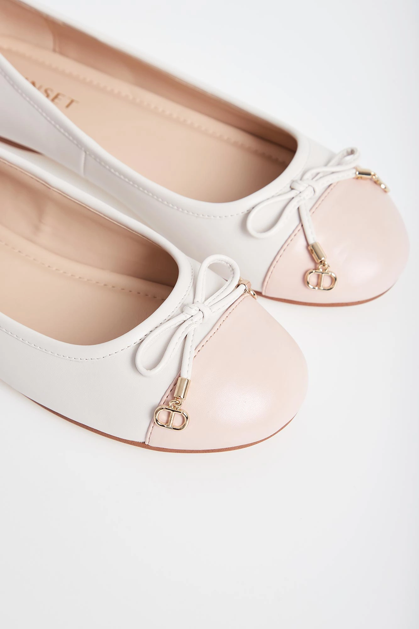- Zaokrąglone noski z kokardką i sygnowanymi zawieszkami.
