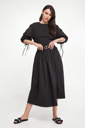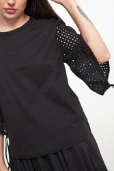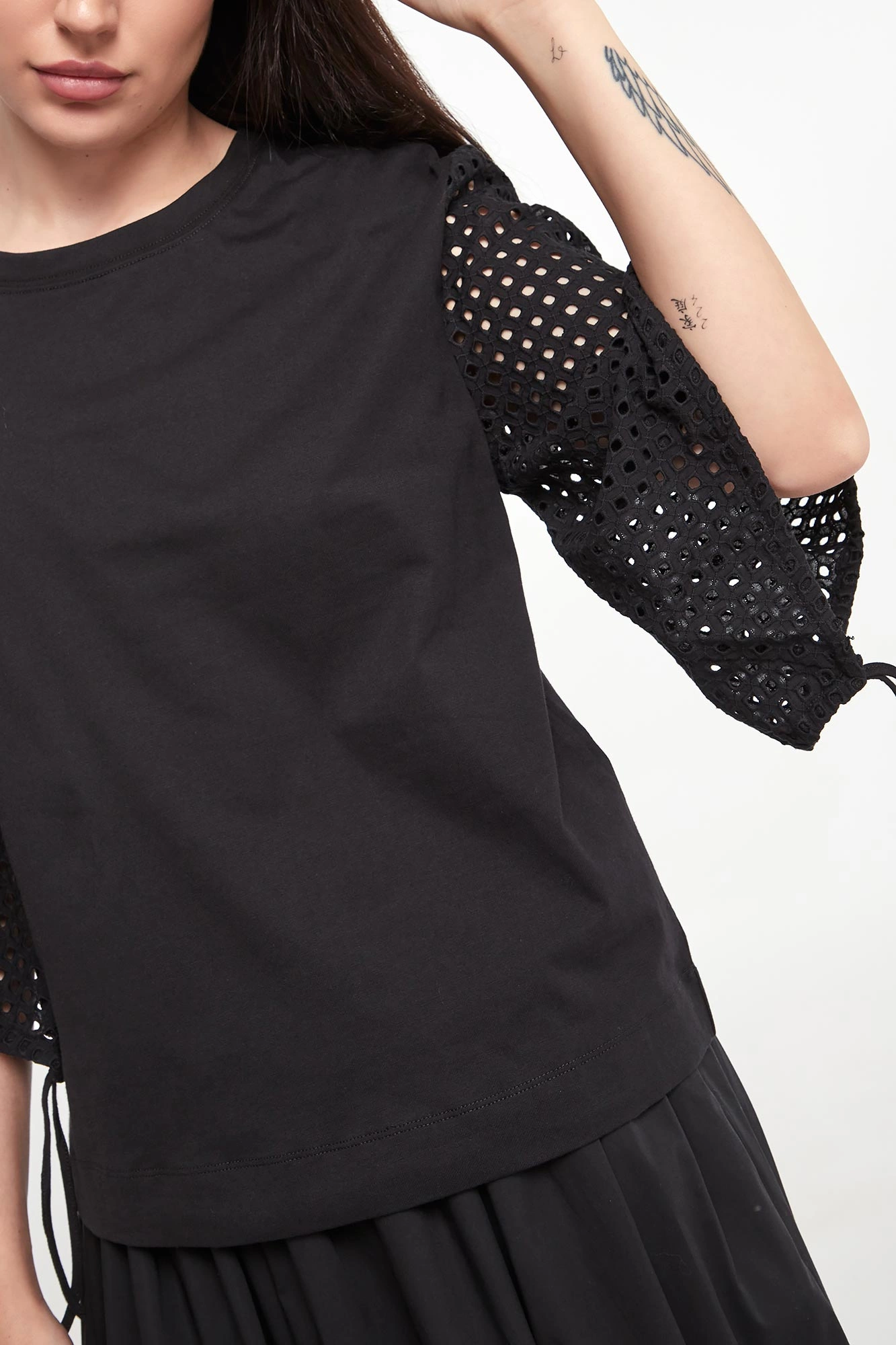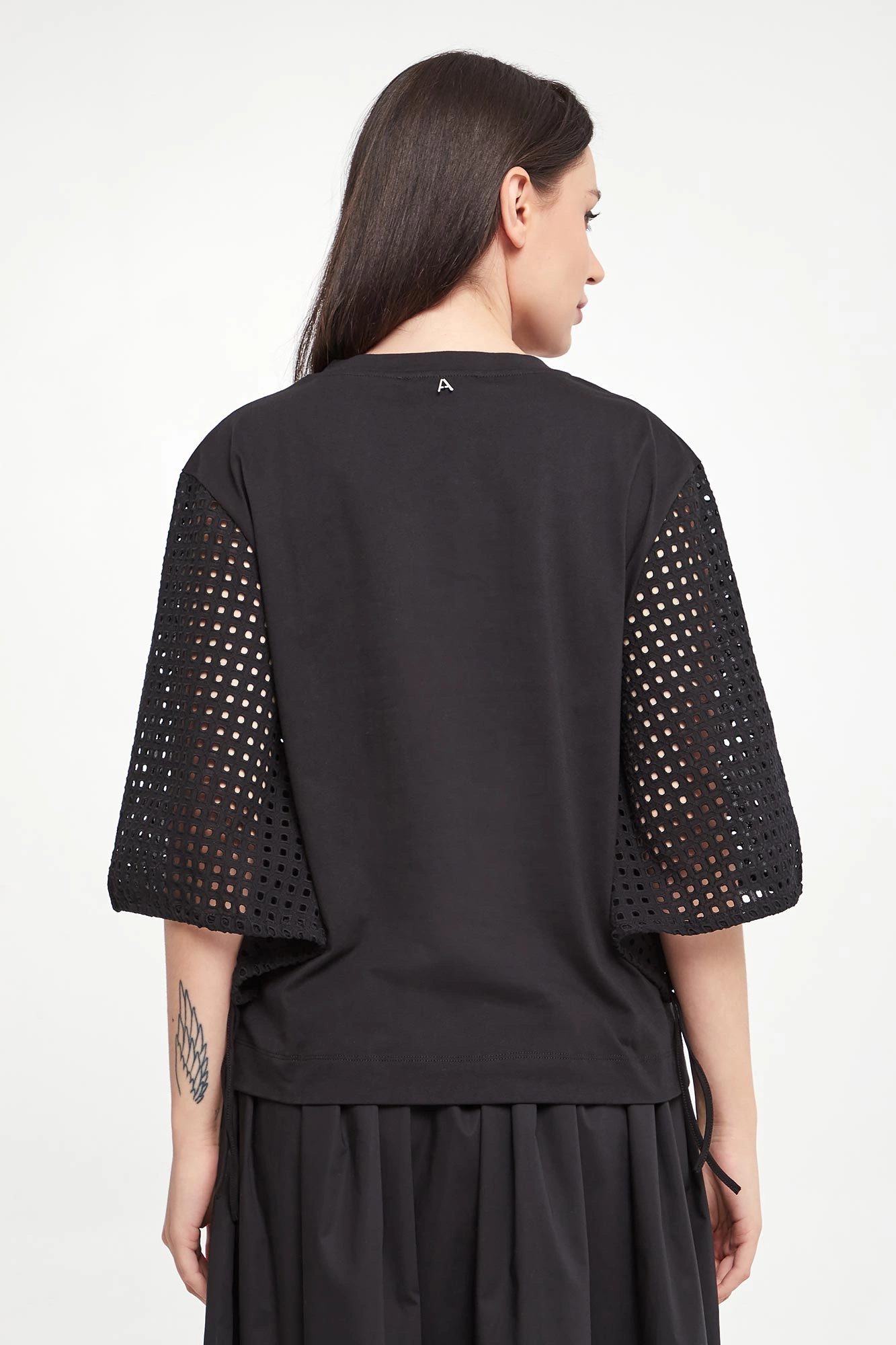 - Krótkie, ażurowe rękawy zakończone wiązaniem.