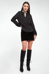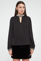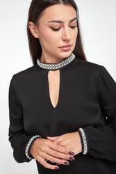 - Dekolt ze stójką i rękawy ozdobione perłami i koralikami.