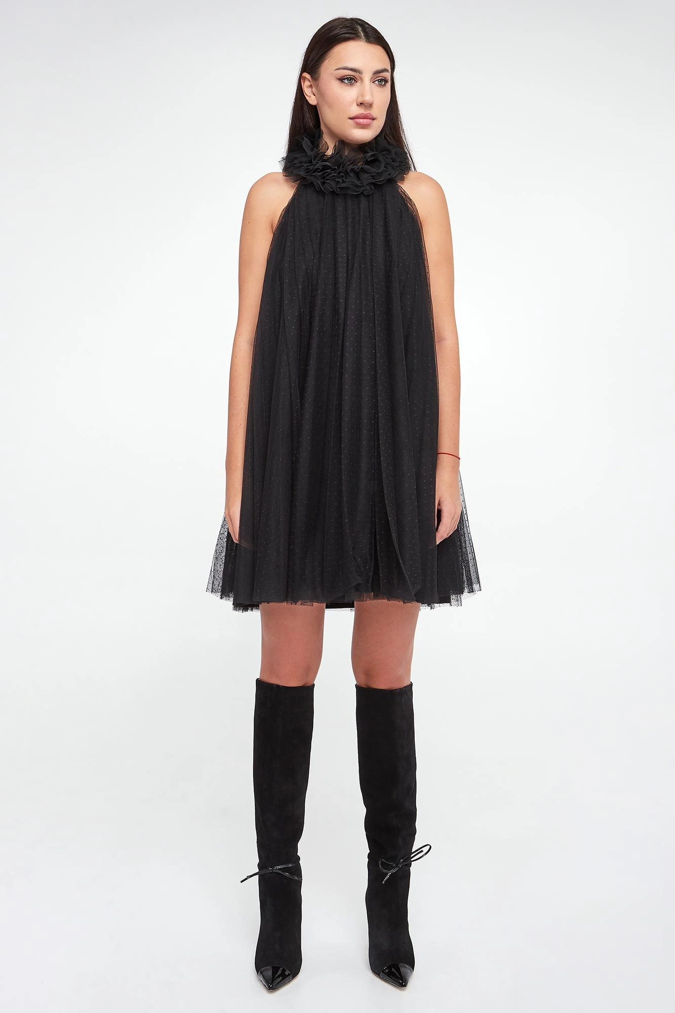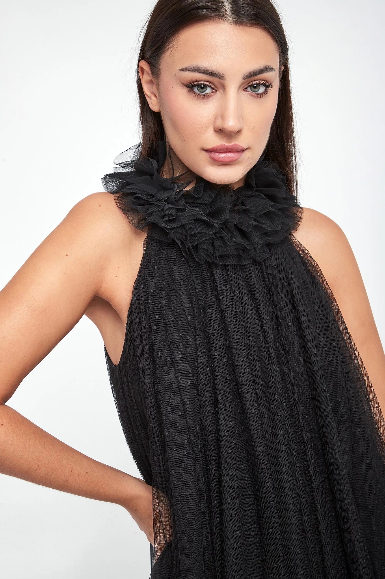- Dekolt typu halter z marszczonym kołnierzem.