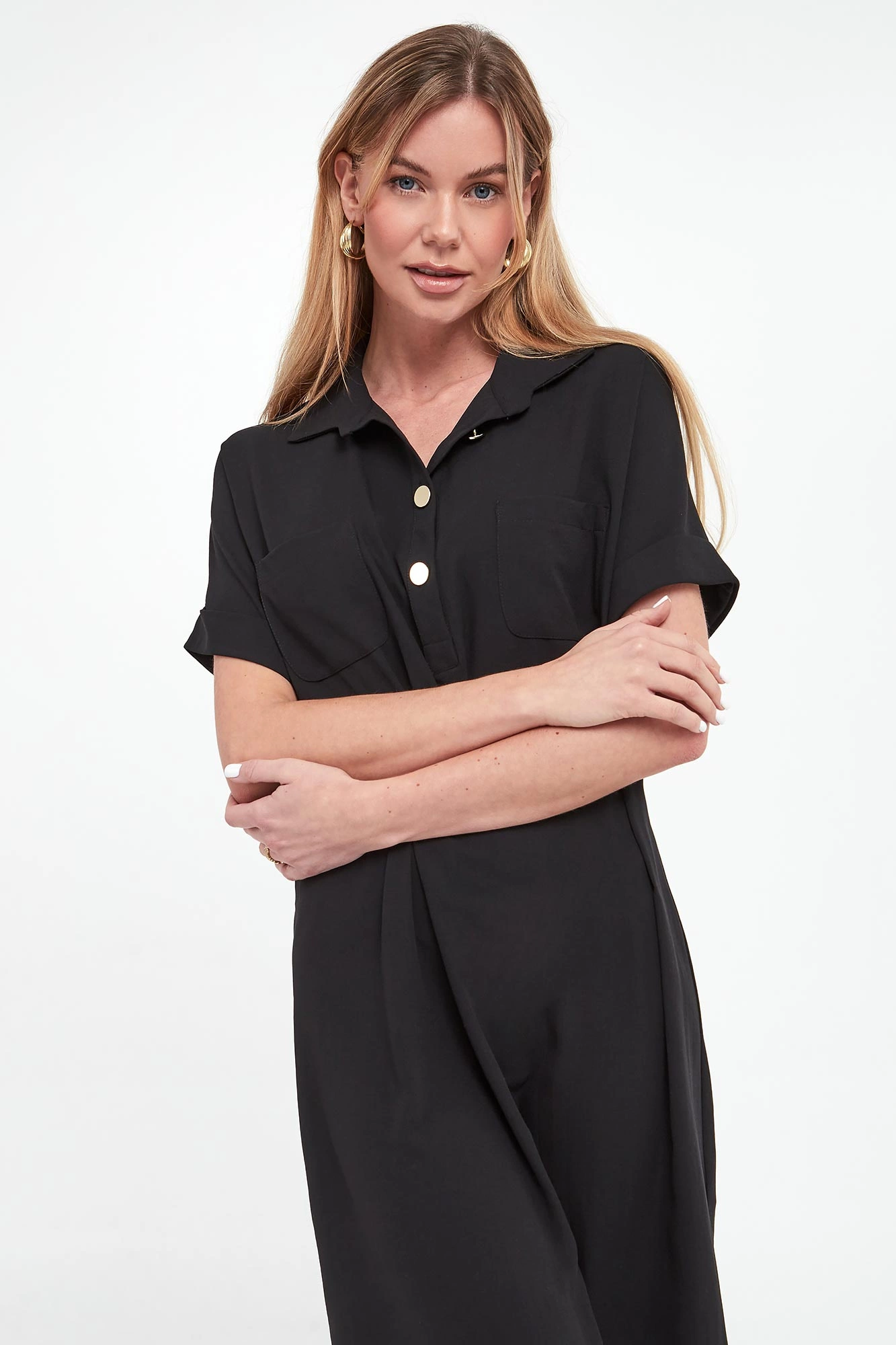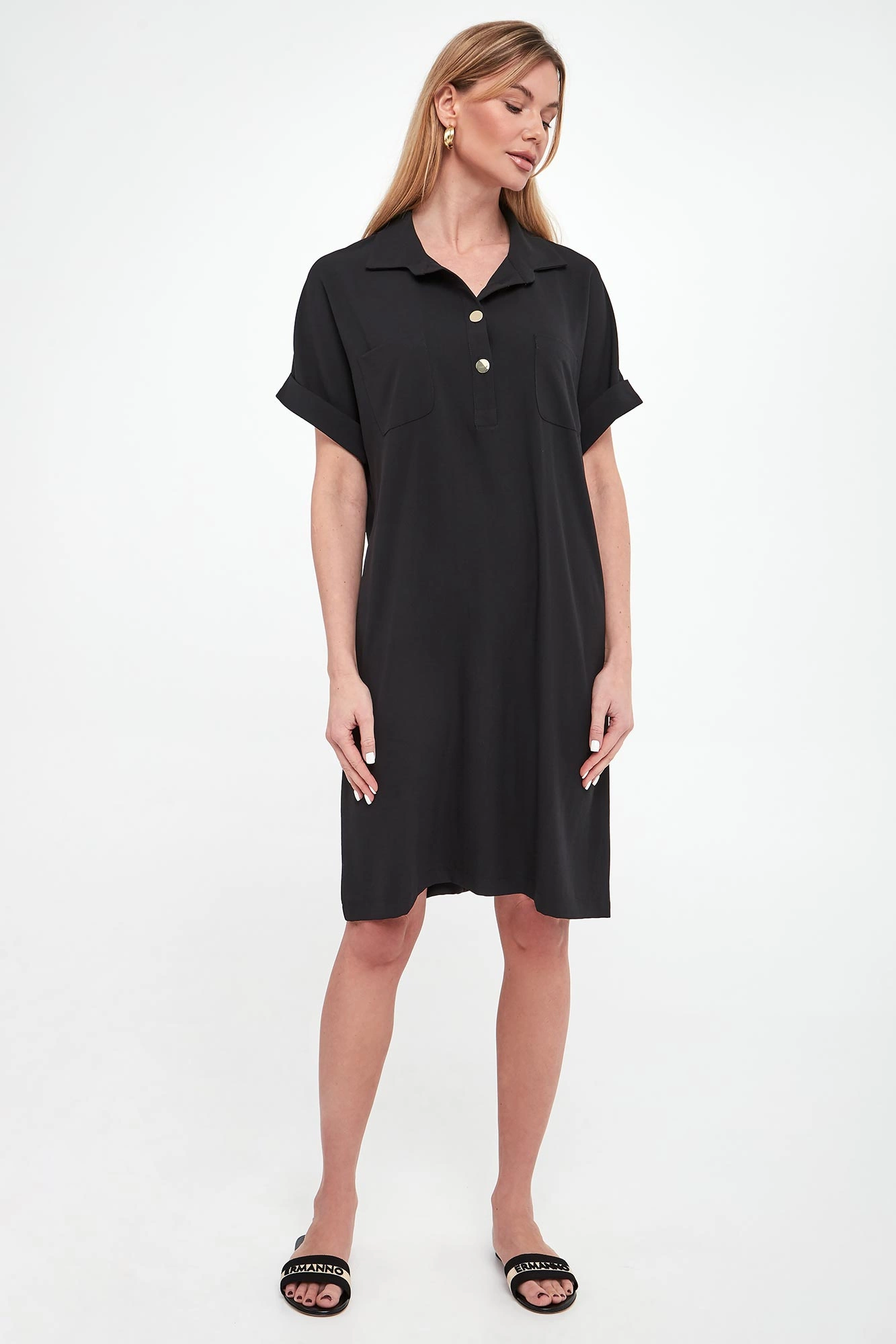 - Dekolt z kołnierzykiem zapinanym na guziki.