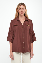 - Rękawy 3/4 zakończone bufkami.
