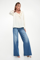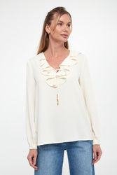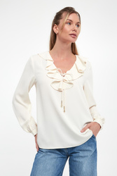- Dekolt z ozdobną falbaną i wiązaniem.