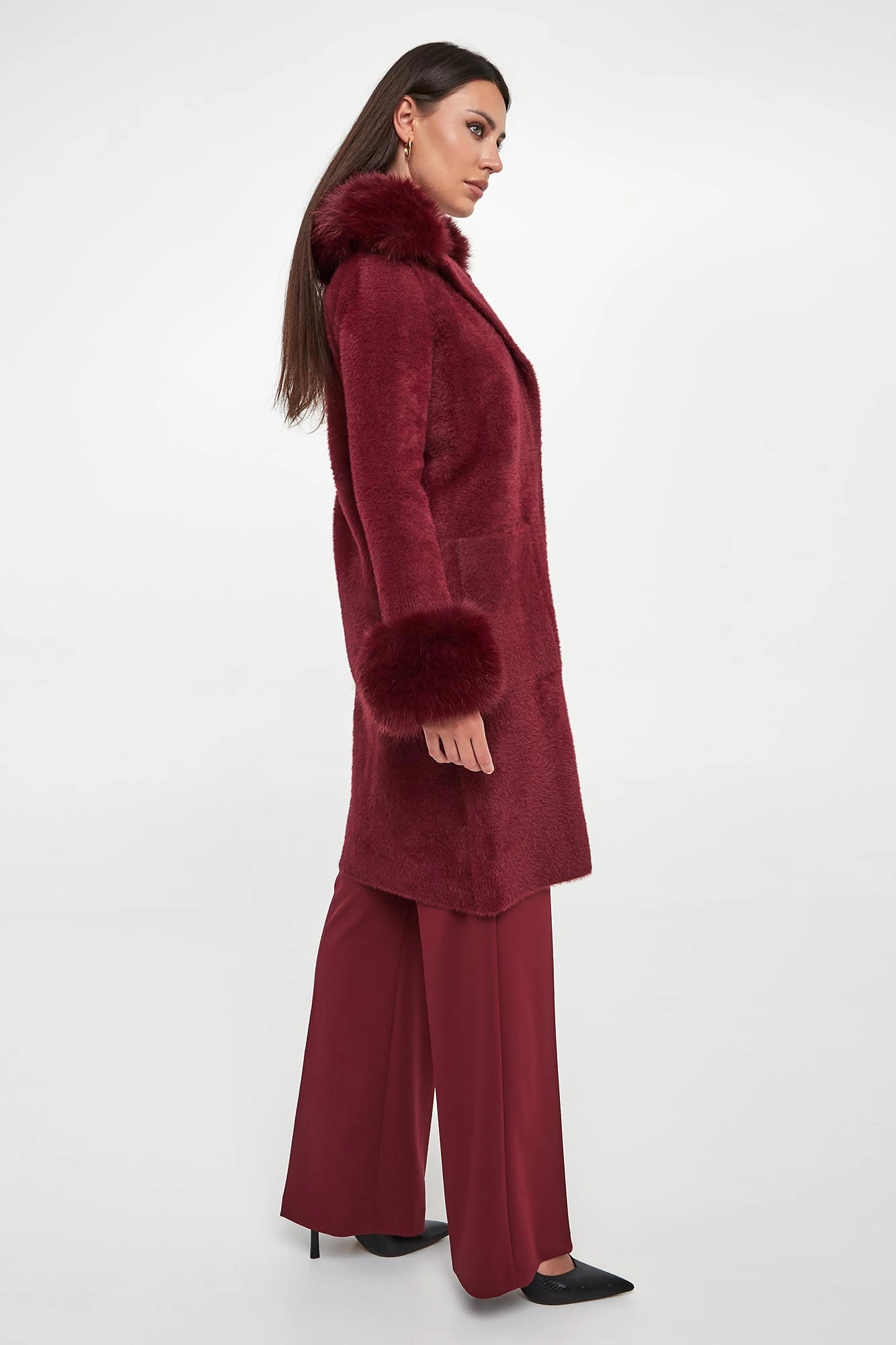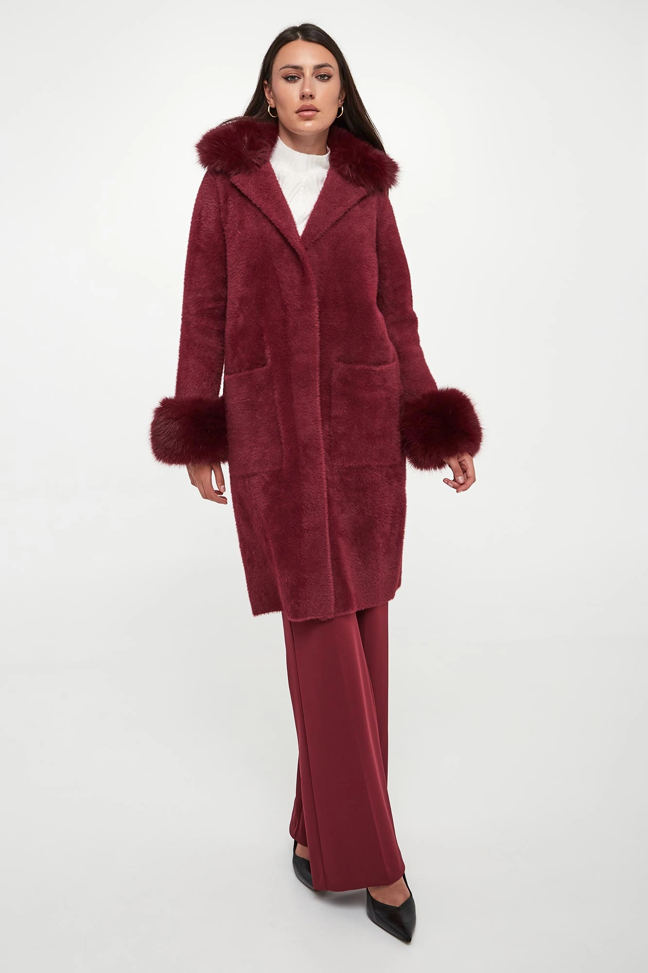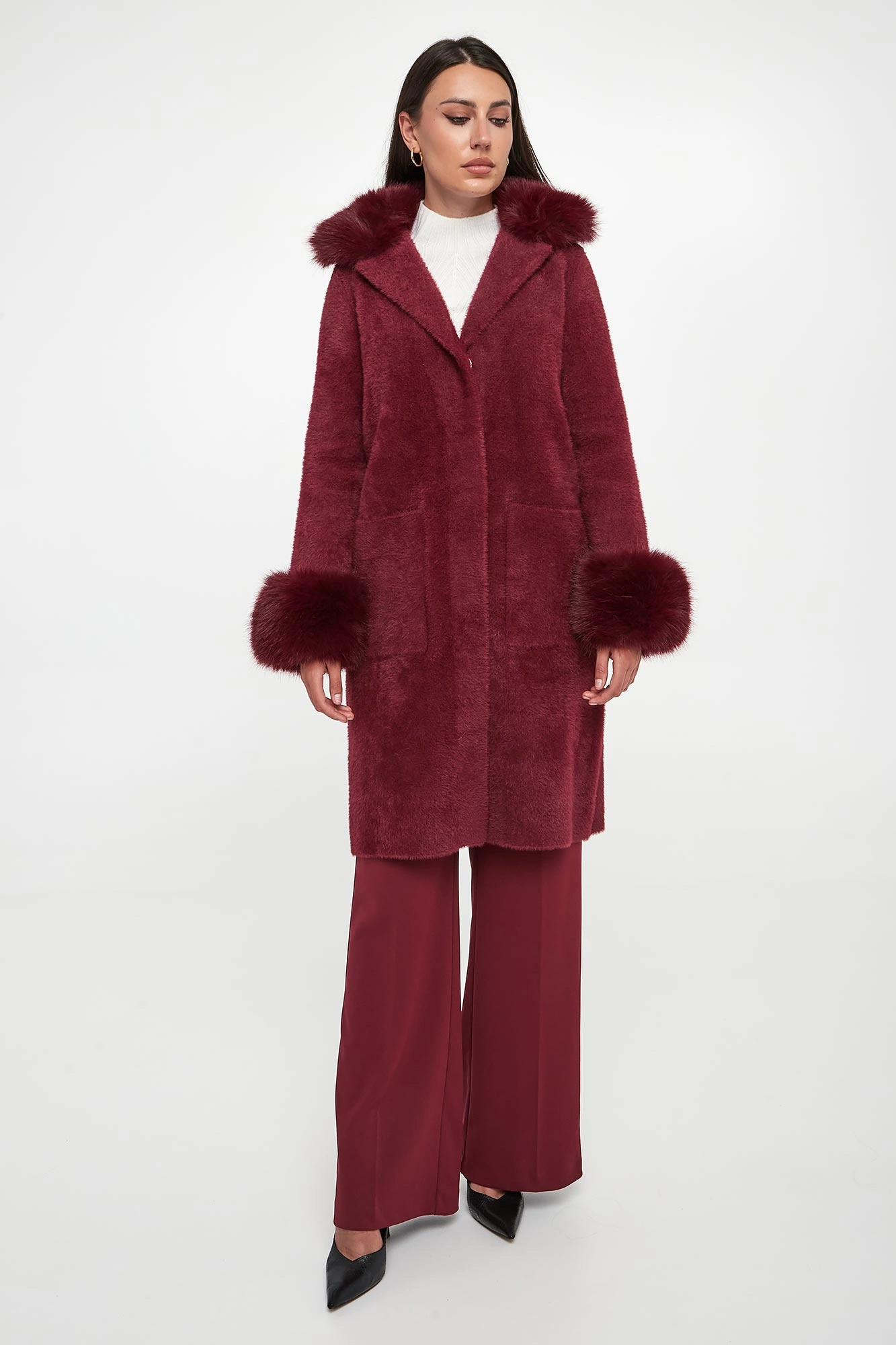 - Kołnierz i rękawy ozdobione odpinanym futrem.