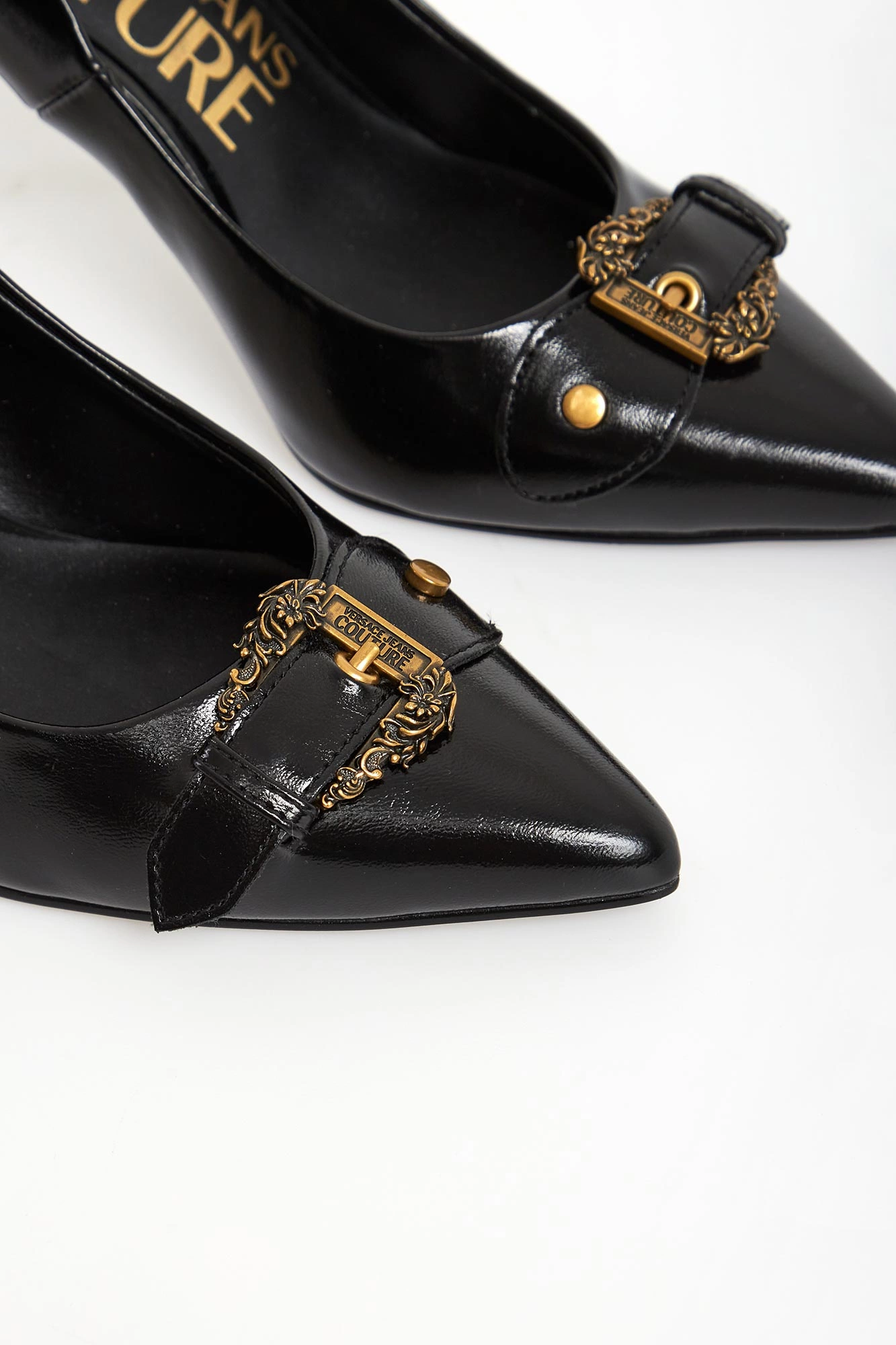 - Złote klamry na czubkach i piętach.