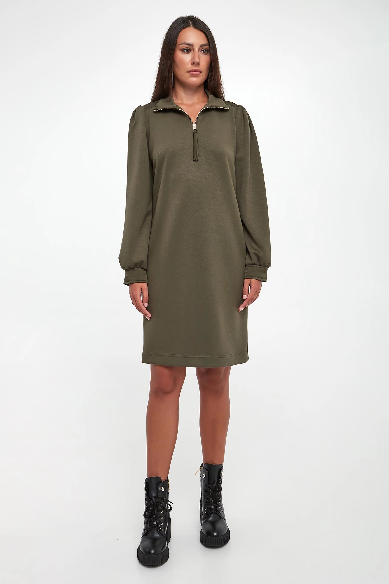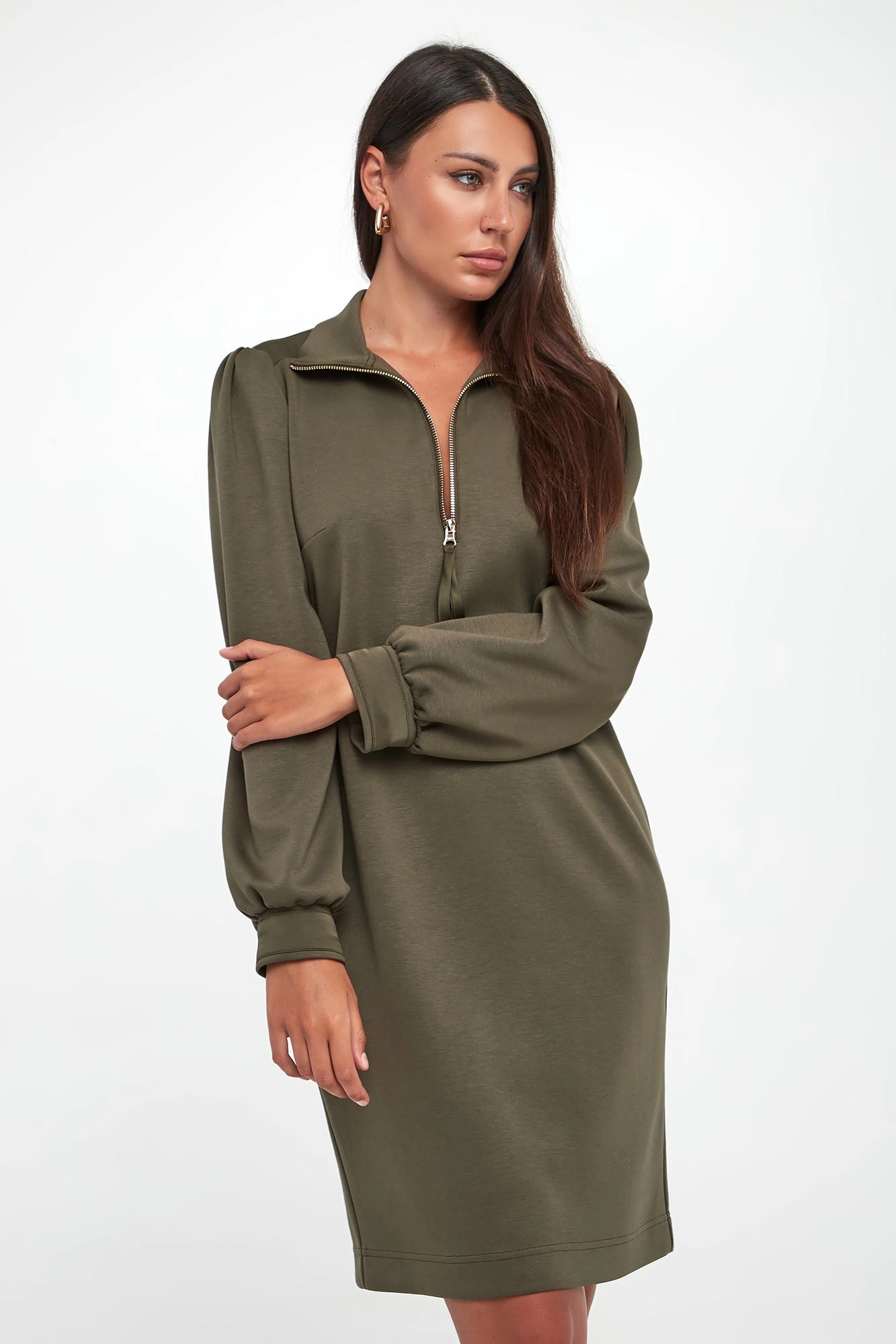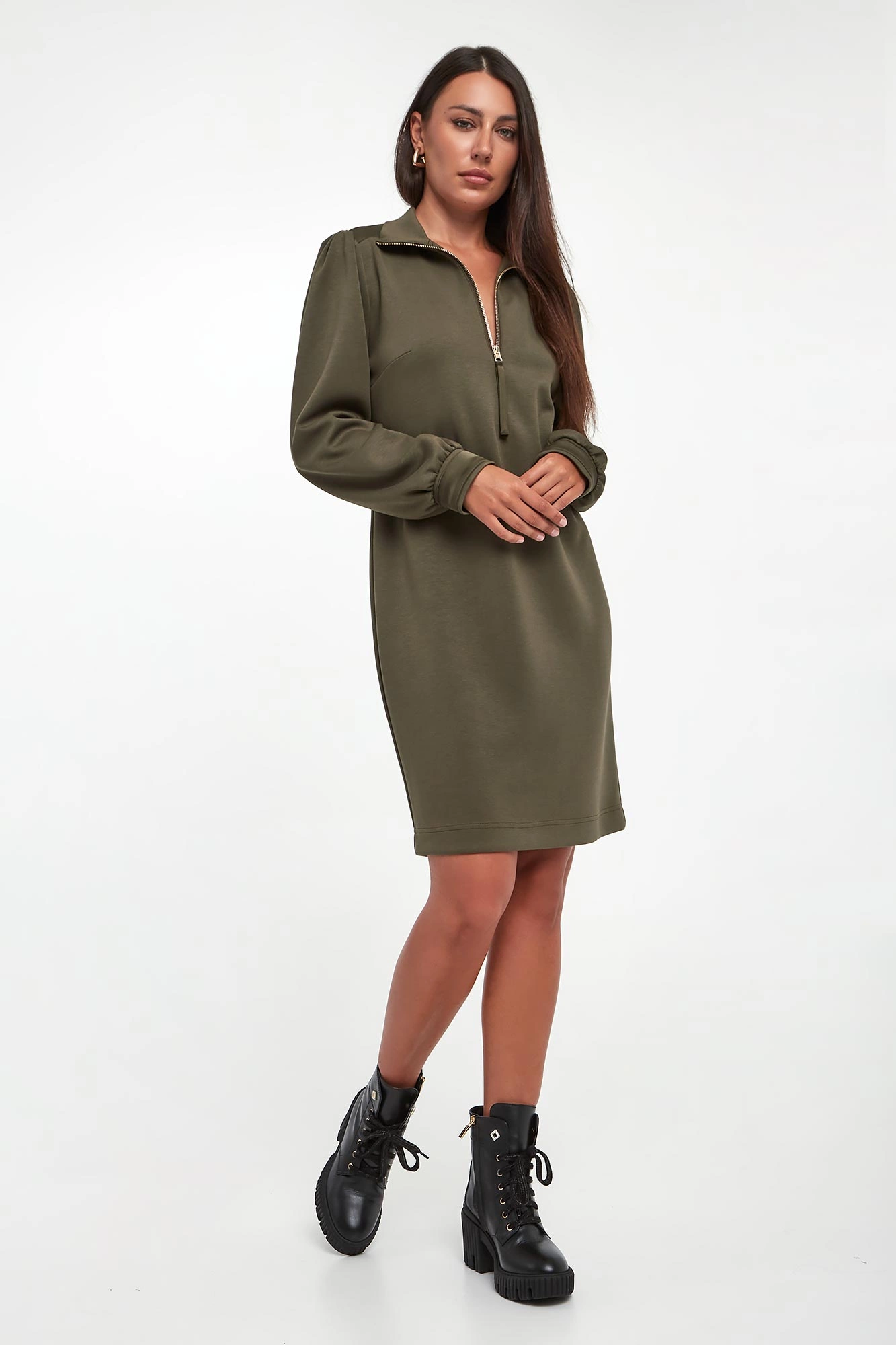 - Dekolt v-neck z kołnierzykiem zapinanym na zamek.
