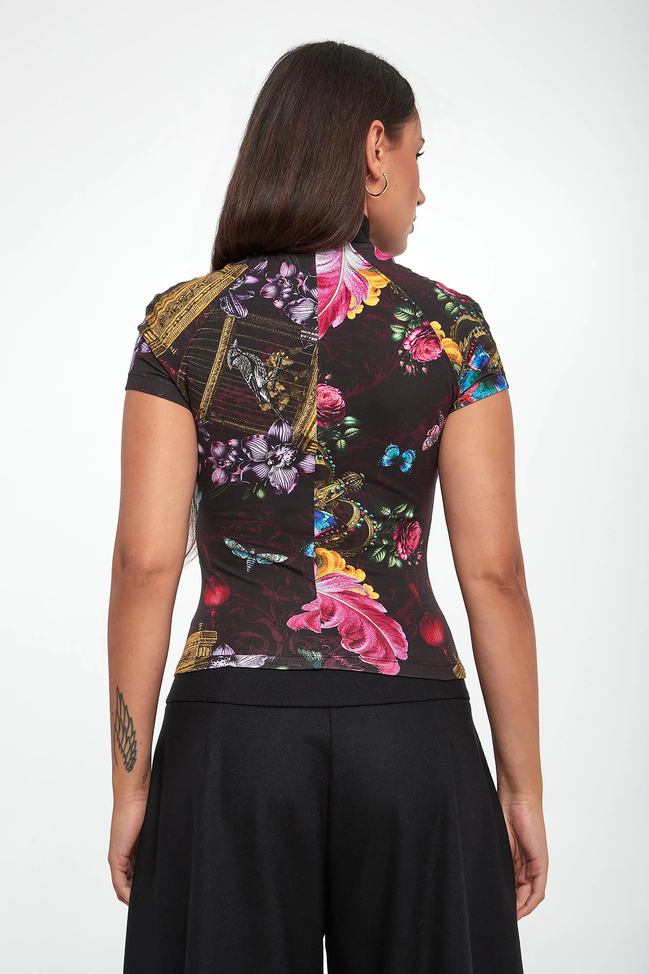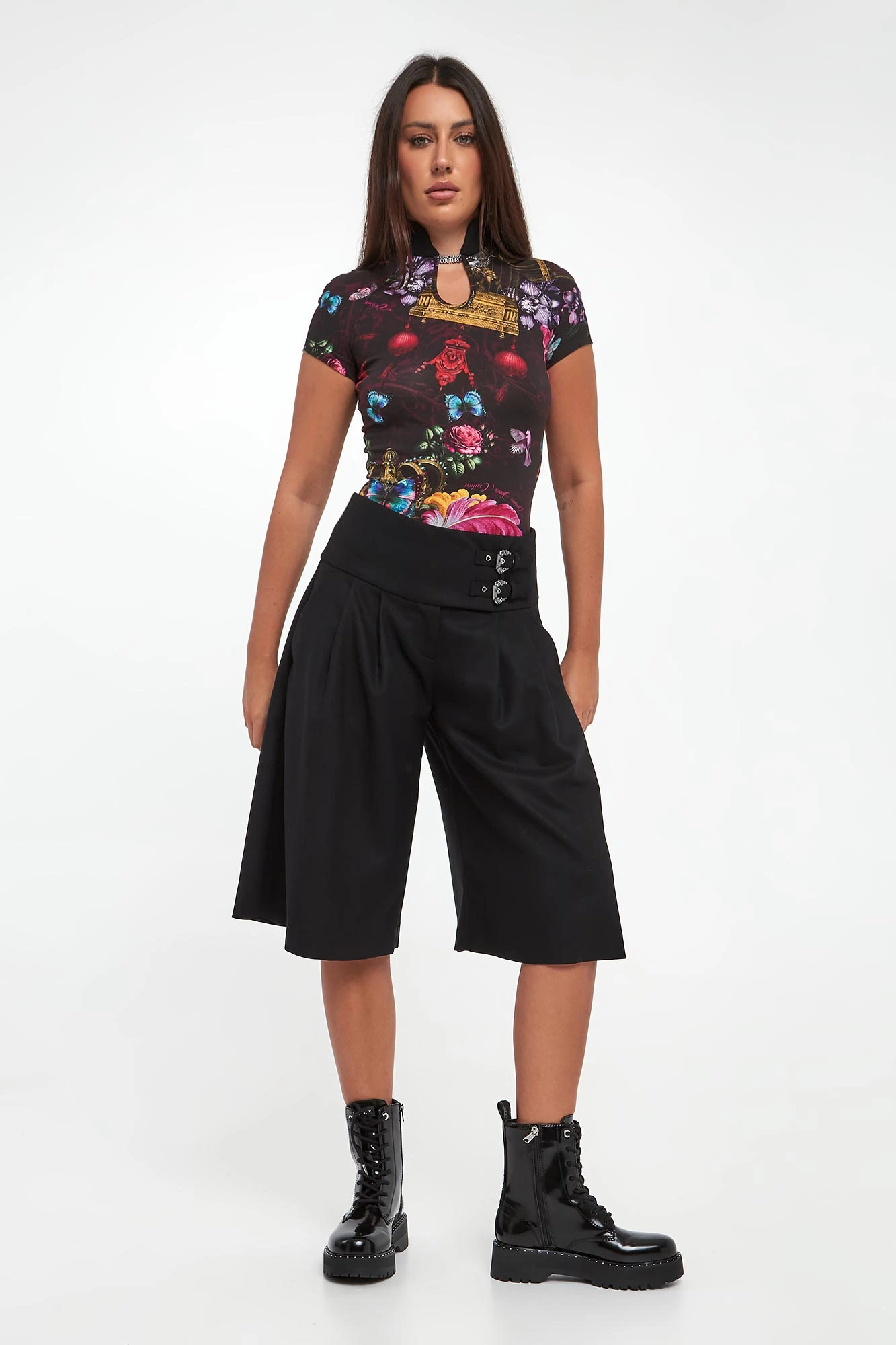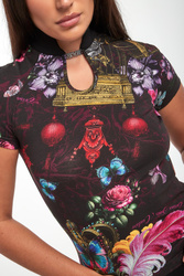 - Dekolt ze stójką, aplikacją z logo i ozdobnym wycięciem.