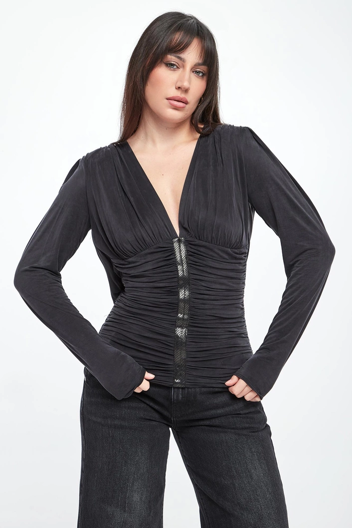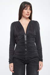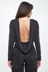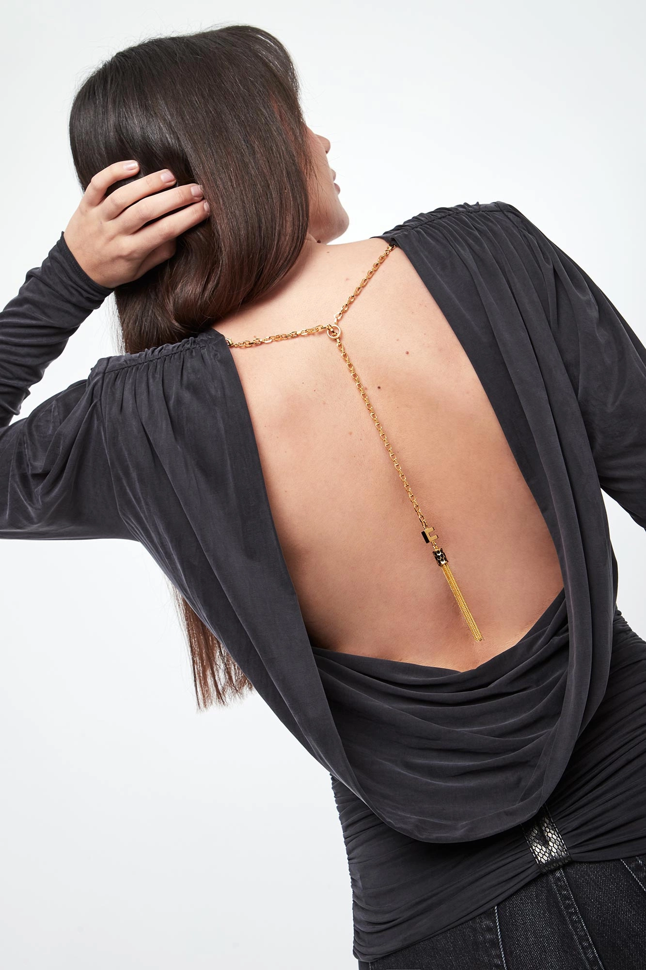 - Na plecach głęboki dekolt z ozdobnym łańcuszkiem.
