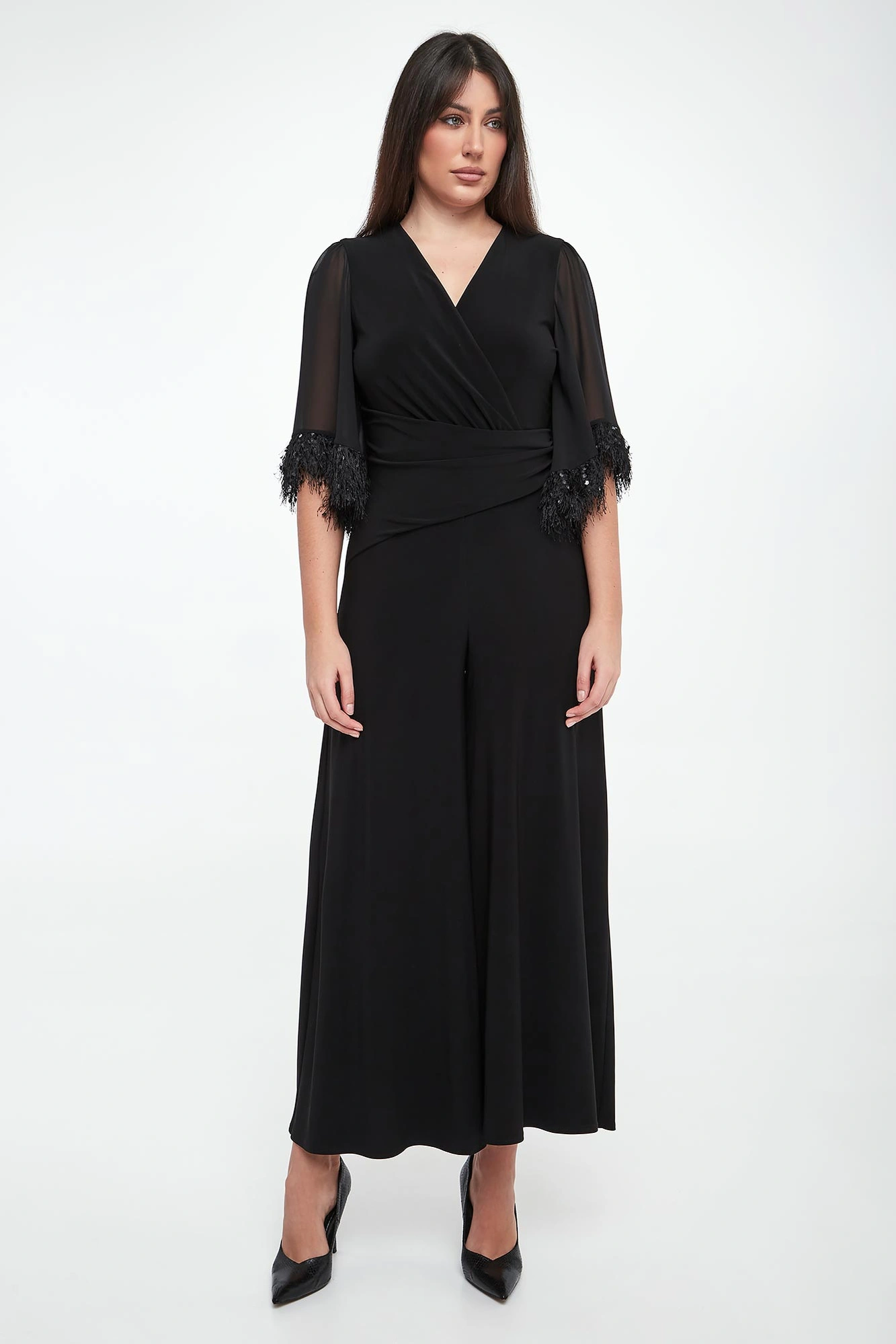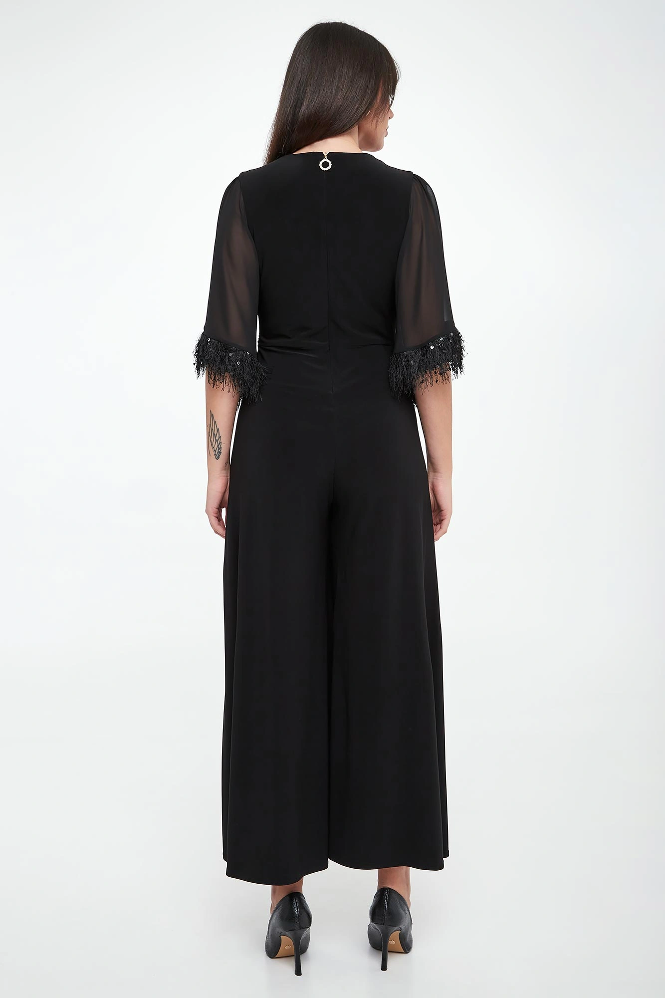 - Bufiaste krótkie rękawy z ozdobnymi cekinami.