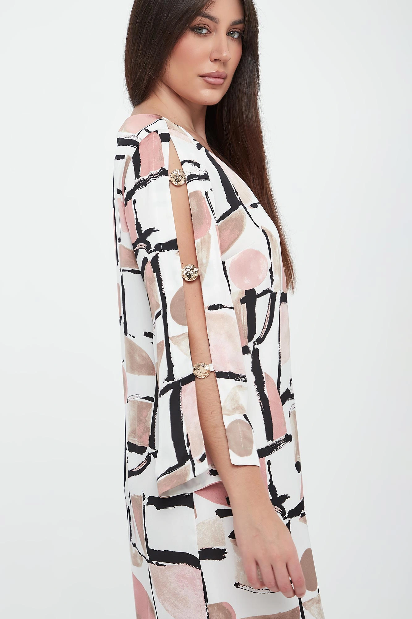 - Rękaw 3/4 z rozcięciami i złotymi zdobieniami.