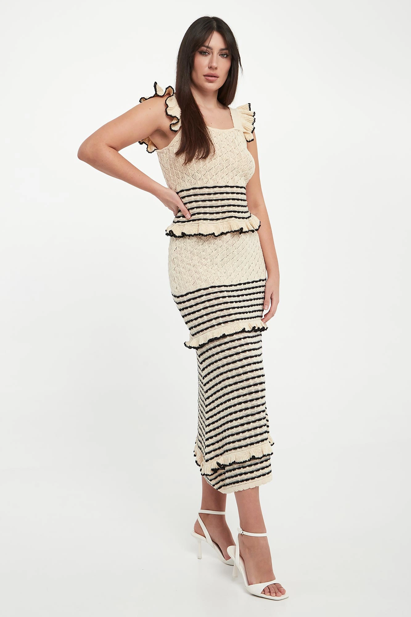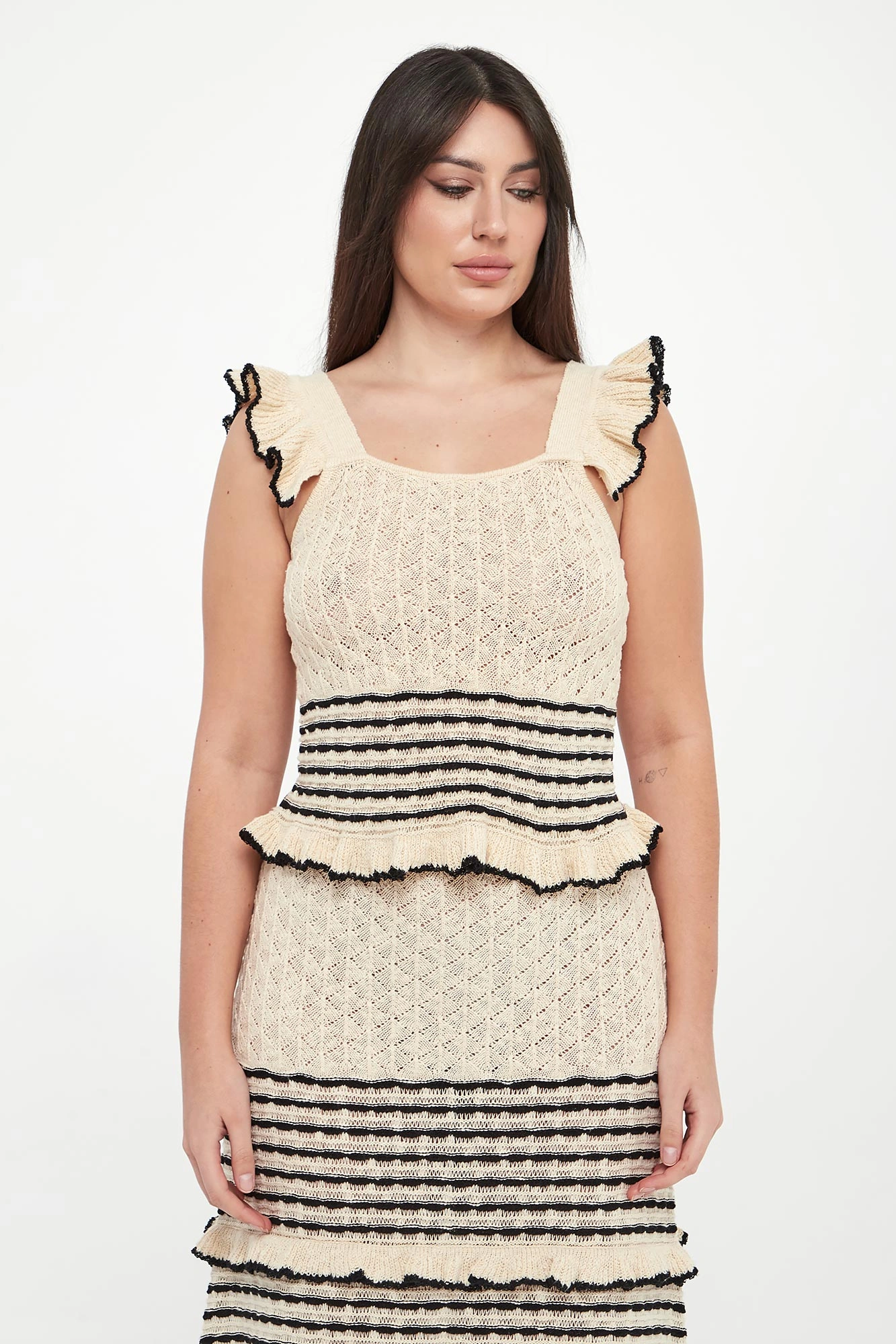 - Ramiączka i dół wykończone falbanami.