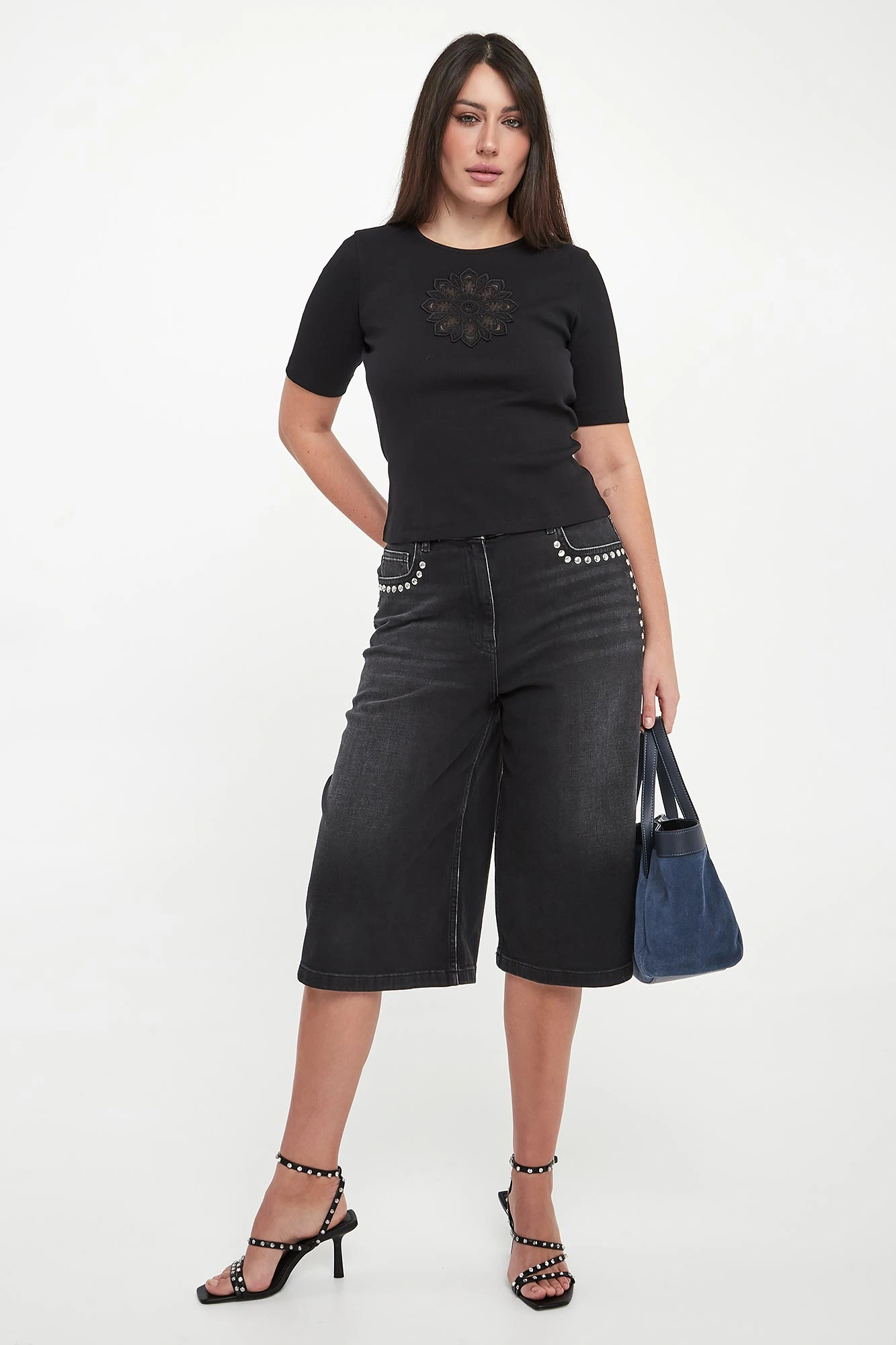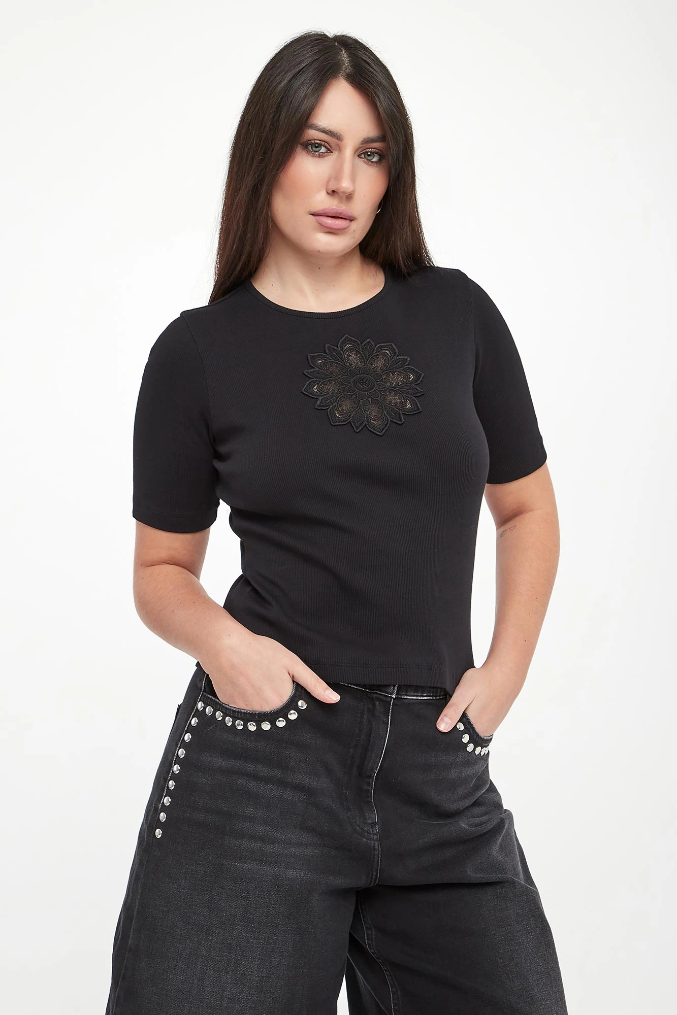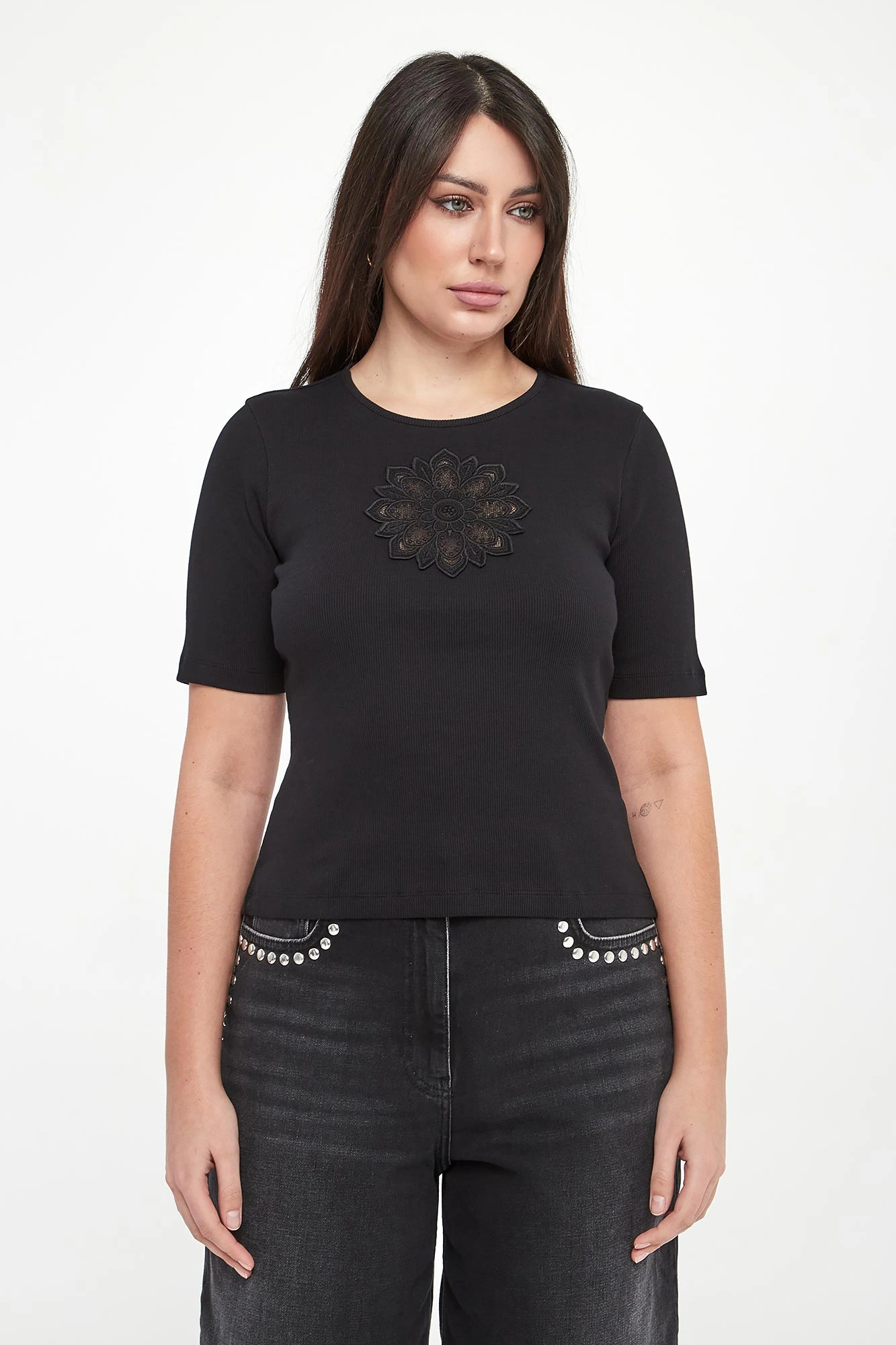 - Ażurowy haft z kwiatowym motywem.