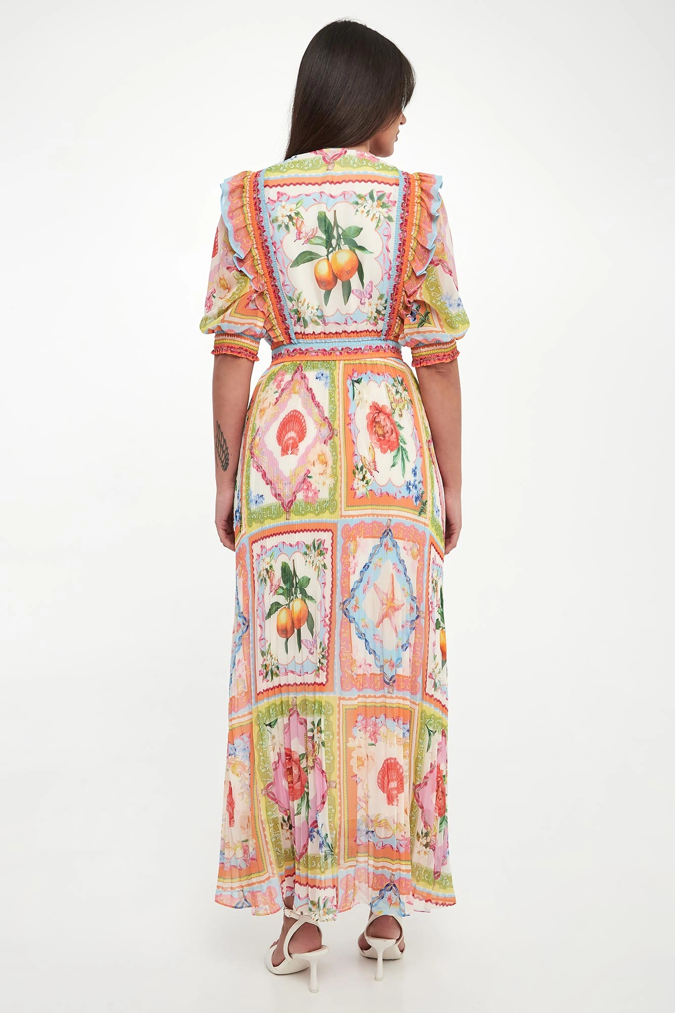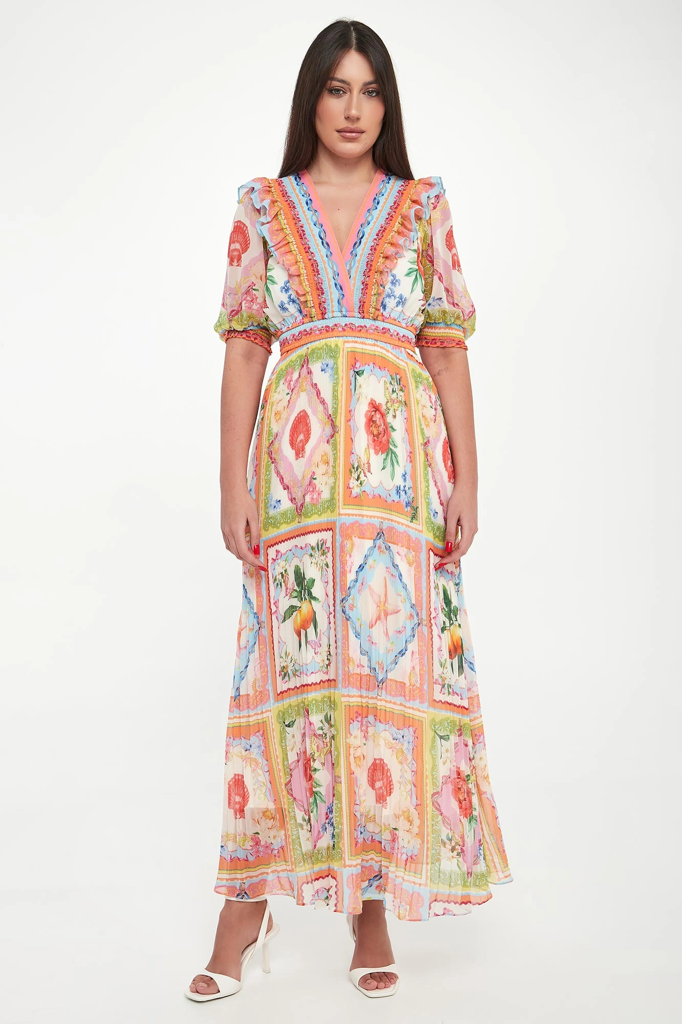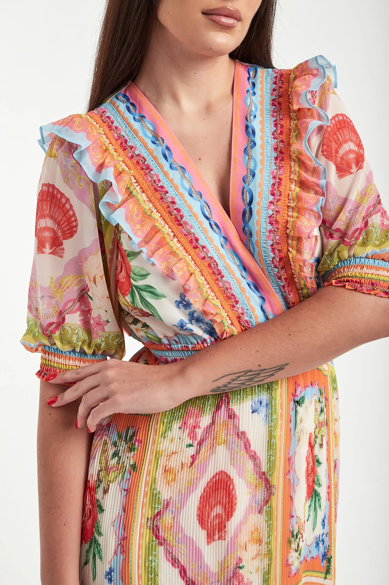 - Dekolt v-neck wykończony falbaną.