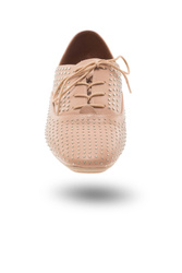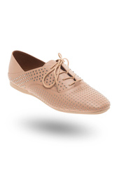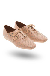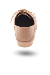 Półbuty w kolorze nude. Wykonane ze skóry naturalnej. Wiązane na sznurówki. Nosek buta ścięty. Cholewka zdobiona drobnymi nitami w kolorze srebrnym. Obcas o wysokości 1 cm.
