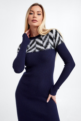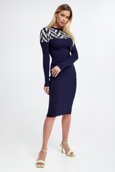 Sukienka marki Sportmax Code w kolorze ciemnoniebieskim. Dekolt typu o-neck wykończony prążkowanym ściągaczem. Model łączony z dwóch materiałów. Góra w kontrastowym geometrycznym wzorze, dół z prążkowanej dzianiny wełnianej. Fason slim, dlugość midi.