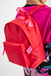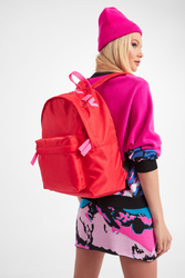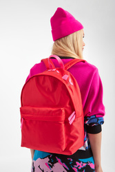 Klasyczny plecak w różowo-czerwonym kolorze. Na głównej klapie duży napis w postaci nazwy marki. Z przodu dwie kieszenie zapinane na zamek z zawieszką w kontrastowym kolorze. Zamek ukryty pod klapką. Podszewka w czarnym kolorze. Wewnątrz dwie kieszenie. Jedna zapinana na zamek. Regulowane szelki. W komplecie worek przeciwkurzowy.